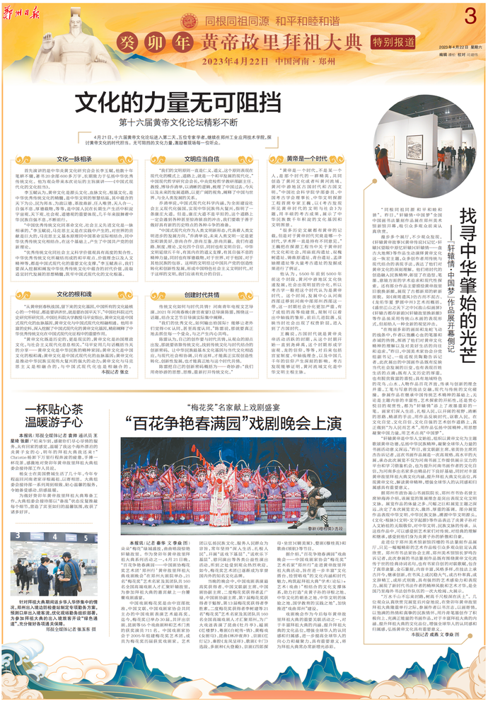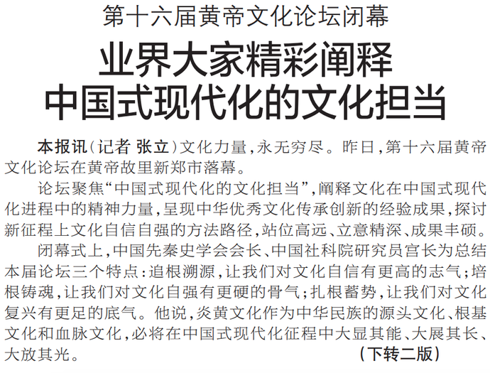 文化力量,永无穷尽。昨日,第十六届黄帝文化论坛在黄帝故里新郑市落幕。(今日《郑州日报》1版、2版)