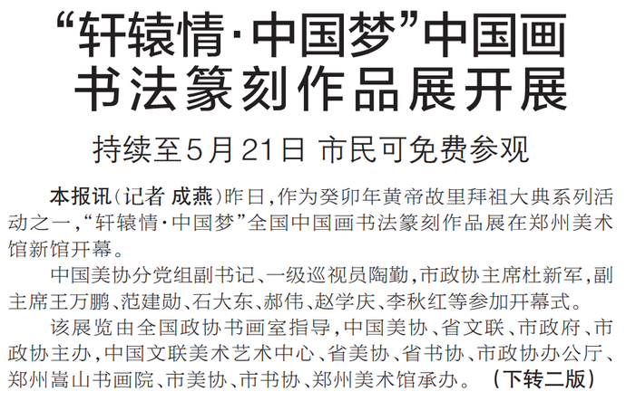 昨日,作为癸卯年黄帝故里拜祖大典系列活动之一,“轩辕情·中国梦”全国中国画书法篆刻作品展在郑州美术馆新馆开幕。(今日《郑州日报》1版、2版)