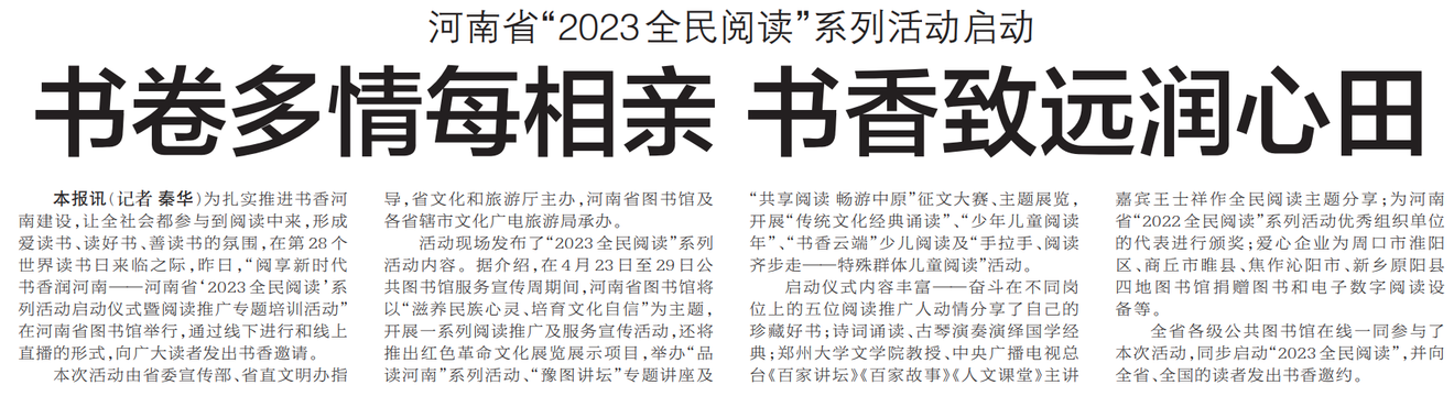为扎实推进书香河南建设,让全社会都参与到阅读中来,形成爱读书、读好书、善读书的氛围,在第28个世界读书日来临之际,昨日,“阅享新时代 书香润河南——河南省‘2023全民阅读’系列活动启动仪式暨阅读推广专题培训活动”在河南省图书馆举行,通过线下进行和线上直播的形式,向广大读者发出书香邀请。(今日《郑州日报》2版)