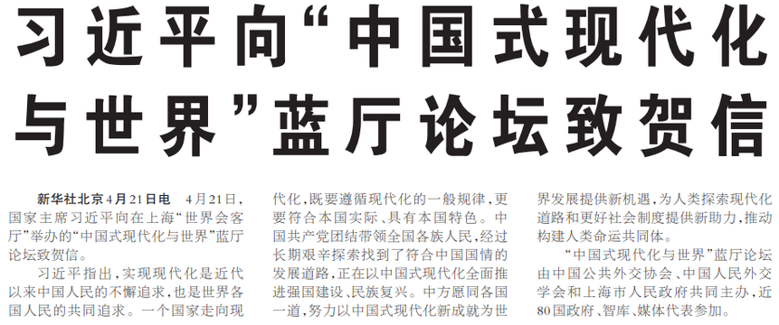4月21日,国家主席习近平向在上海“世界会客厅”举办的“中国式现代化与世界”蓝厅论坛致贺信。(今日《人民日报》1版)