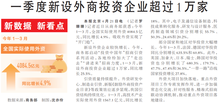 一季度新设外商投资企业超过1万家