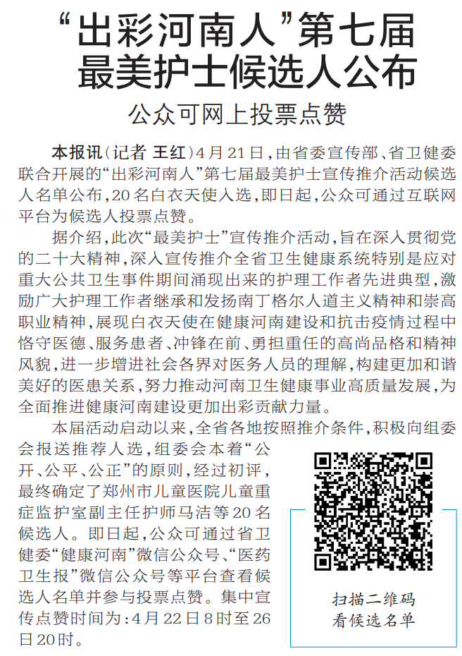 4月21日,由省委宣传部、省卫健委联合开展的“出彩河南人”第七届最美护士宣传推介活动候选人名单公布,20名白衣天使入选,即日起,公众可通过互联网平台为候选人投票点赞。(今日《郑州日报》2版)