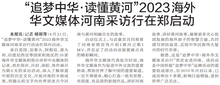 4月21日,“追梦中华·读懂黄河”2023海外华文媒体河南采访行活动在郑州启动。(今日《郑州日报》2版)