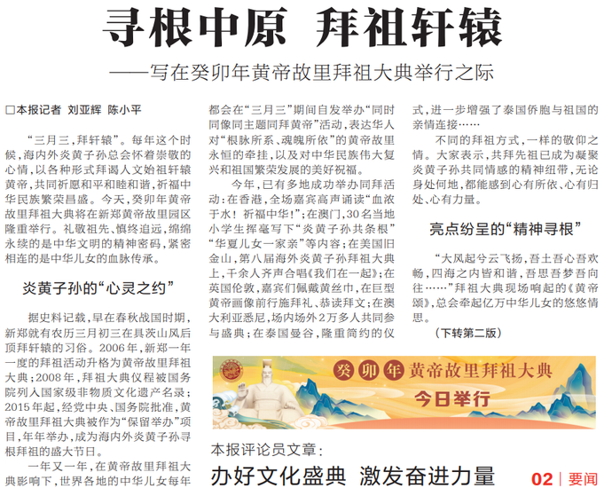 “三月三,拜轩辕”。每年这个时候,海内外炎黄子孙总会怀着崇敬的心情,以各种形式拜谒人文始祖轩辕黄帝,共同祈愿和平和睦和谐,祈福中华民族繁荣昌盛。今天,癸卯年黄帝故里拜祖大典将在新郑黄帝故里园区隆重举行。礼敬祖先、慎终追远,绵绵永续的是中华文明的精神密码,紧密相连的是中华儿女的血脉传承。(今日《河南日报》1版、2版)