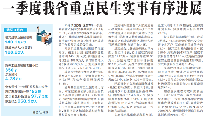 一季度,我省重点民生实事进展如何?4月21日,记者从省发展改革委获悉,我省10件重点民生实事进展顺利,其中职业技能培训、农村公路改造等工作超额完成阶段目标。(今日《河南日报》3版)