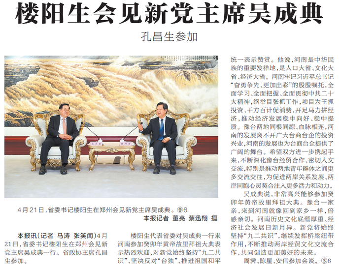 4月21日,省委书记楼阳生在郑州会见新党主席吴成典一行。省政协主席孔昌生参加。