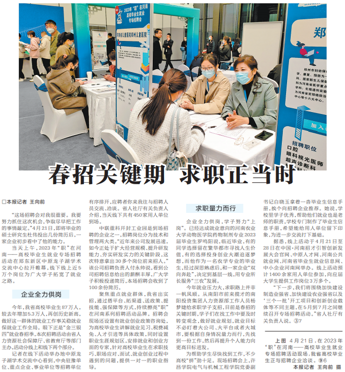 当天上午,2023年“职”在河南——高校毕业生就业专场招聘活动在郑东新区中原龙子湖学术交流中心拉开帷幕,线下线上近5万个岗位为广大学子拓宽了就业之路。(今日《河南日报》3版)