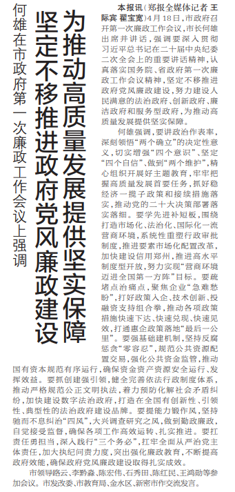 4月18日,市政府召开第一次廉政工作会议,市长何雄出席并讲话,强调要深入贯彻习近平总书记在二十届中央纪委二次全会上的重要讲话精神,认真落实国务院、省政府第一次廉政工作会议精神,坚定不移推进政府党风廉政建设,努力建设人民满意的法治政府、创新政府、廉洁政府和服务型政府,为推动高质量发展提供坚实保障。