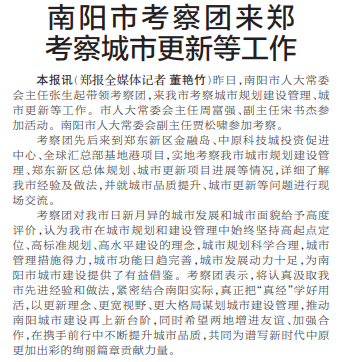 昨日,南阳市人大常委会主任张生起带领考察团,来我市考察城市规划建设管理、城市更新等工作。市人大常委会主任周富强、副主任宋书杰参加活动。南阳市人大常委会副主任贾松啸参加考察。(今日《郑州日报》1版)