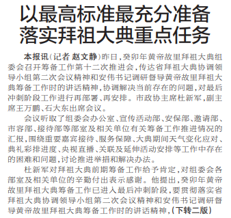 昨日,癸卯年黄帝故里拜祖大典组委会召开筹备工作第十二次推进会,传达省拜祖大典协调领导小组第二次会议精神和安伟书记调研督导黄帝故里拜祖大典筹备工作时的讲话精神,协调解决当前存在的问题,对最后冲刺阶段工作进行再部署、再安排。市政协主席杜新军,副主席王万鹏、石大东出席会议。(今日《郑州日报》1版、2版)