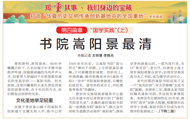 春和景明,清风徐来。4500岁巍巍古柏下,几名汉服少年手捧书卷朗声吟诵,伴随着清幽的鸟鸣声声入耳,似要带人穿越回千年前那极负盛名的至高学府——嵩阳书院。时光流转,这里闪耀着的大圣先贤灿若星辰的思想光辉,在千年后的今天,依旧散发出别样的光彩。(今日《郑州日报》1版、2版)