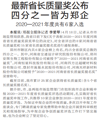 4月18日,记者从市市场监管局获悉,我省日前下发《关于表彰2020—2021年度河南省省长质量奖获奖单位的决定》,对全省评出的8家河南省省长质量奖和15家省长质量奖提名奖进行通报表彰。(今日《郑州日报》1版)