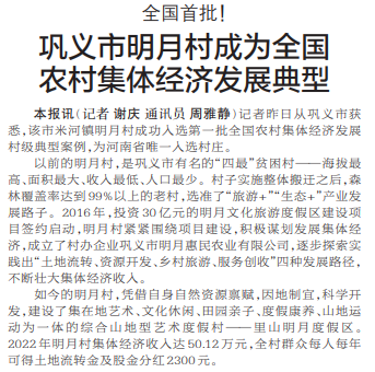 记者昨日从巩义市获悉,该市米河镇明月村成功入选第一批全国农村集体经济发展村级典型案例,为河南省唯一入选村庄。(今日《郑州日报》2版)