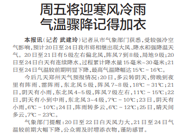 记者从市气象部门获悉,受较强冷空气影响,预计20日至24日我市将相继出现大风、降水和强降温天气。20日至21日有5级左右偏北风,阵风7到8级,局地9级;20日至24日白天有连续降水,过程累计降水量15毫米~30毫米;21日至24日气温较前期明显下降,最高气温降幅达15℃~16℃。(今日《郑州日报》2版)