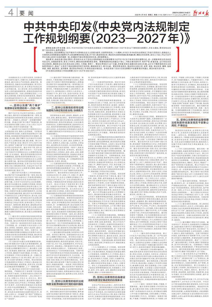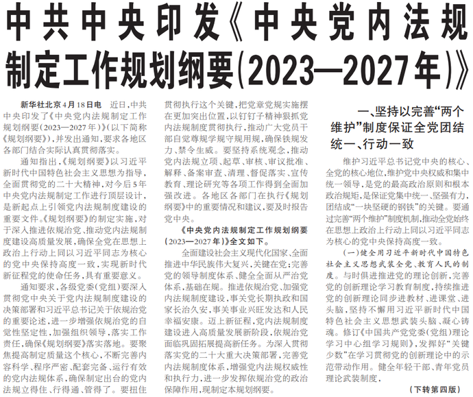 近日,中共中央印发了《中央党内法规制定工作规划纲要(2023—2027年)》,并发出通知,要求各地区各部门结合实际认真贯彻落实。(今日《人民日报》1版、4版)