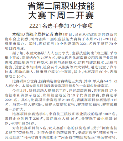 昨日,记者从省政府新闻办新闻发布会上获悉,河南省第二届职业技能大赛将于本月25日~28日在濮阳市举办。届时,将有来自19个代表团的2221名选手展开70个项目的角逐。(今日《郑州日报》5版)