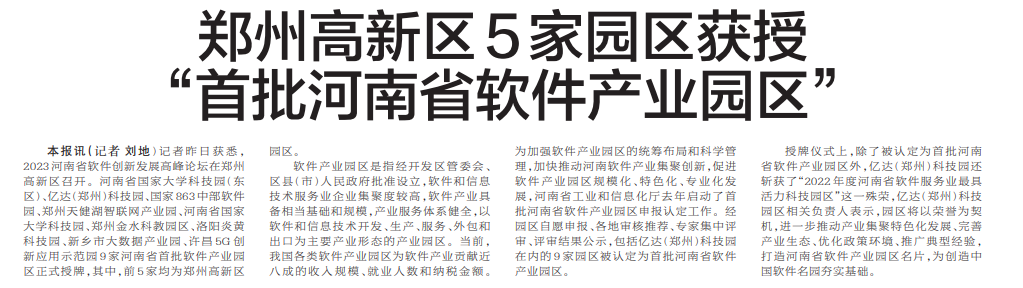 郑州高新区5家园区获授“首批河南省软件产业园区”
