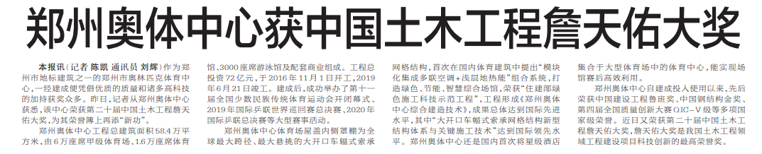 作为郑州市地标建筑之一的郑州市奥林匹克体育中心,一经建成便凭借优质的质量和诸多高科技的加持获奖众多。昨日,记者从郑州奥体中心获悉,该中心荣获第二十届中国土木工程詹天佑大奖,为其荣誉簿上再添“新功”。(今日《郑州日报》8版)