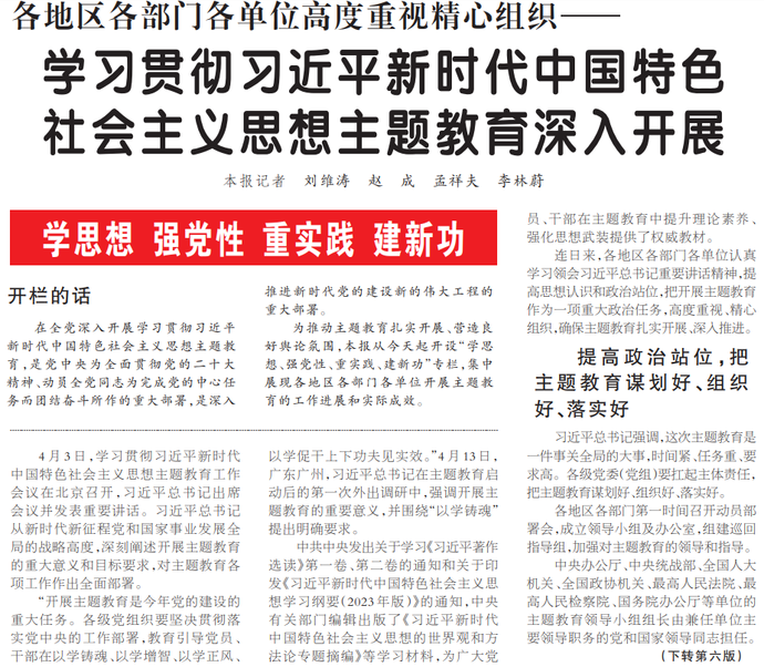 为推动主题教育扎实开展、营造良好舆论氛围,本报从今天起开设“学思想、强党性、重实践、建新功”专栏,集中展现各地区各部门各单位开展主题教育的工作进展和实际成效。