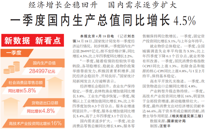 4月18日,国家统计局发布一季度经济运行情况。初步核算,一季度国内生产总值284997亿元,按不变价格计算,同比增长4.5%,比上年四季度环比增长2.2%。(今日《人民日报》1版)