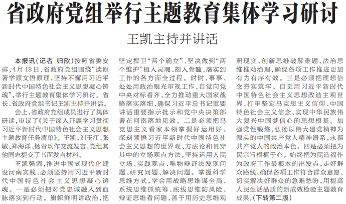 按照省委安排,4月18日,省政府党组围绕“读原著学原文悟原理,坚持不懈用习近平新时代中国特色社会主义思想凝心铸魂”,举行主题教育集体学习研讨。省长、省政府党组书记王凯主持并讲话。(今日《河南日报》1版、2版)