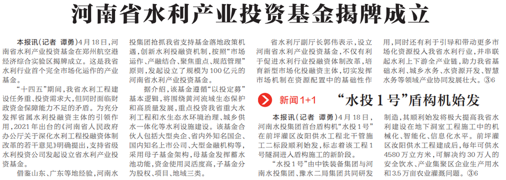 4月18日,河南省水利产业投资基金在郑州航空港经济综合实验区揭牌成立。这是我省水利行业首个完全市场化运作的产业基金。(今日《河南日报》2版)