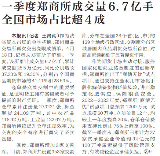 作为我省资本市场的金字招牌,郑州商品交易所再次交出亮眼成绩单。4月18日,记者从郑商所了解到,一季度,该所累计成交量6.7亿手,累计成交额25.5万亿元,同比分别增长37.23%和19.30%,分别占全国商品期货市场的41.41%和28.63%。(今日《河南日报》2版)