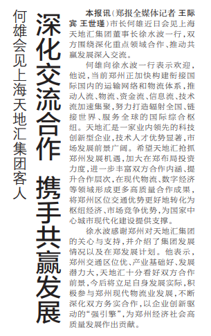 市长何雄近日会见上海天地汇集团董事长徐水波一行,双方围绕深化重点领域合作、推动共赢发展深入交流。(今日《郑州日报》1版)