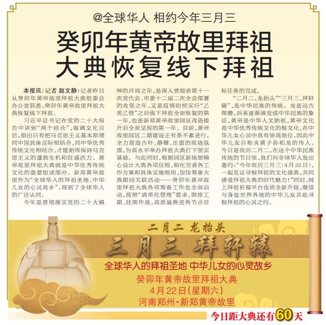 记者昨日从癸卯年黄帝故里拜祖大典组委会办公室获悉,癸卯年黄帝故里拜祖大典恢复线下拜祖。(今日《郑州日报》1版)