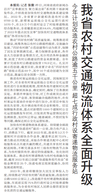昨日,河南省政府新闻办召开“实事惠民生 聚力谋出彩”系列第十场新闻发布会,介绍我省加快农村交通物流体系建设情况。2022年,全省累计新建和改造农村公路9789公里,新增客运班线公交化运营行政村1070个,在2.9万个行政村设立了村级寄递物流综合服务站,全省覆盖面达到64.4%,均超额完成了2022年重点民生实事“加快农村交通物流体系建设”各项目标任务。(今日《郑州日报》1版)