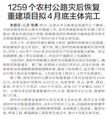 昨日,记者从市公路事业发展中心了解到,为加快推进农村公路灾后重建工作,省市各级政府和有关部门多方联动,紧急申请亚投行贷款,积极推进郑州等地特大暴雨洪涝灾害灾后恢复重建项目,1259个项目计划4月底主体完成。(今日《郑州日报》1版)