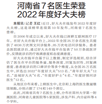 近日,好大夫在线发布2022年度好大夫榜,这是该榜单连续第10年发布,河南省7名医生登榜。(今日《郑州日报》2版)
