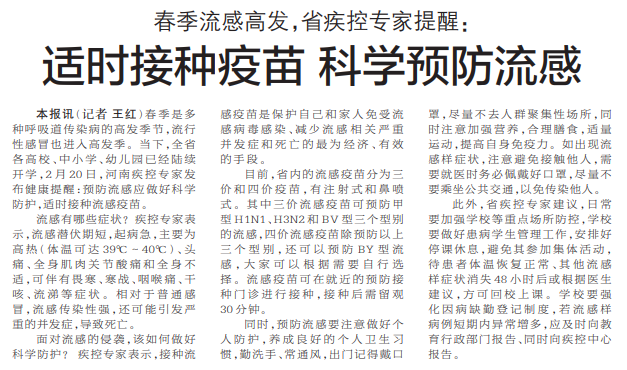 春季是多种呼吸道传染病的高发季节,流行性感冒也进入高发季。当下,全省各高校、中小学、幼儿园已经陆续开学,2月20日,河南疾控专家发布健康提醒:预防流感应做好科学防护,适时接种流感疫苗。(今日《郑州日报》2版)