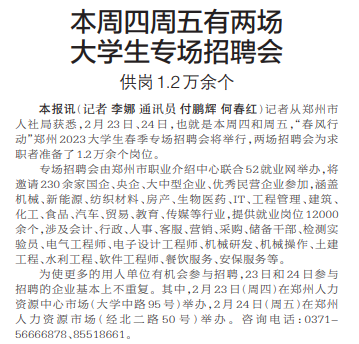 记者从郑州市人社局获悉,2月23日、24日,也就是本周四和周五,“春风行动”郑州2023大学生春季专场招聘会将举行,两场招聘会为求职者准备了1.2万余个岗位。(今日《郑州日报》2版)