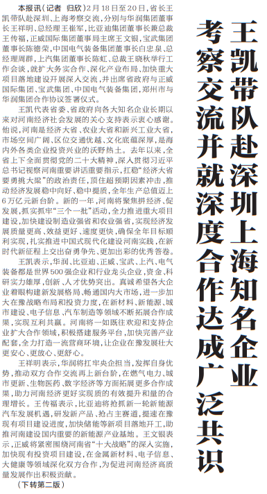 2月18日至20日,省长王凯带队赴深圳、上海考察交流,分别与华润集团董事长王祥明、总经理王崔军,比亚迪集团董事长兼总裁王传福,正威国际集团董事局主席王文银,宝武集团董事长陈德荣,中国电气装备集团董事长白忠泉、总经理周群,上汽集团董事长陈虹、总裁王晓秋举行工作会谈,就扩大务实合作、深化产业布局、加快重大项目落地建设开展深入交流,并出席省政府与正威国际集团、宝武集团、中国电气装备集团,郑州市与华润集团合作协议签署仪式。(今日《河南日报》1版、2版)
