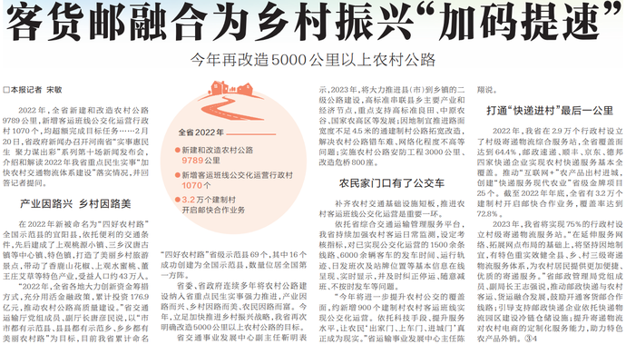 2022年,全省新建和改造农村公路9789公里,新增客运班线公交化运营行政村1070个,均超额完成目标任务……2月20日,省政府新闻办召开河南省“实事惠民生聚力谋出彩”系列第十场新闻发布会,介绍和解读2022年我省重点民生实事“加快农村交通物流体系建设”落实情况,并回答记者提问。(今日《河南日报》4版)