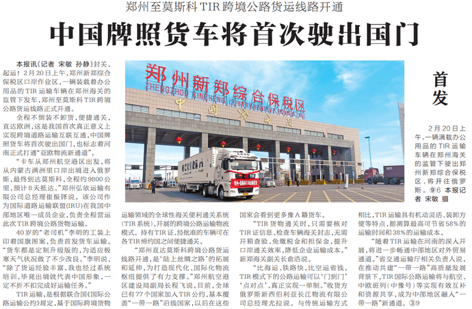 封关,起运!2月20日上午,郑州新郑综合保税区口岸作业区,一辆装载着办公用品的TIR运输车辆在郑州海关的监管下发车,郑州至莫斯科TIR跨境公路货运线路正式开通。(今日《河南日报》1版)