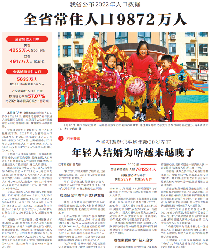 2022年河南人口知多少?2月20日,省统计局发布了去年我省人口数据相关情况。总体来看,2022年我省常住人口总量继续下降,城镇化水平稳步提升。(今日《河南日报》5版)