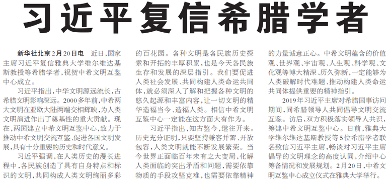 近日,国家主席习近平复信雅典大学维尔维达基斯教授等希腊学者,祝贺中希文明互鉴中心成立。(今日《人民日报》1版)