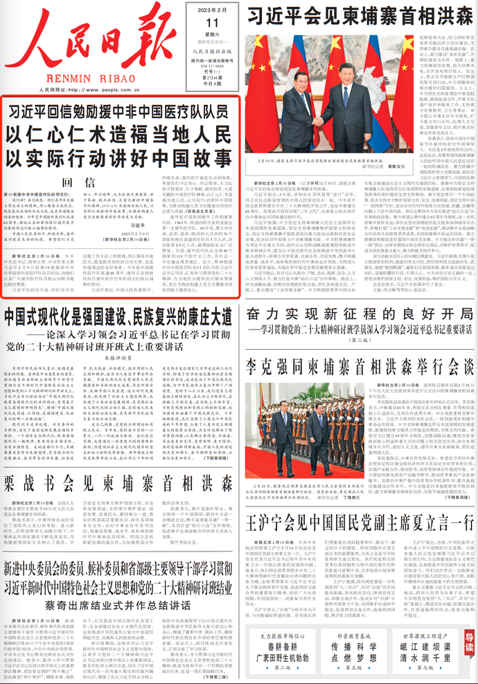 中共中央总书记、国家主席、中央军委主席习近平2月9日给第19批援助中非共和国的中国医疗队队员回信,向他们以及广大援外医疗队员致以问候并提出殷切期望。(今日《人民日报》1版)