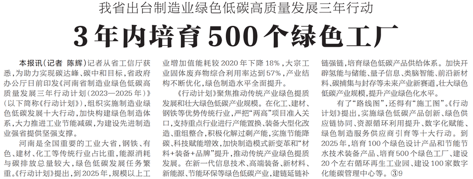 记者从省工信厅获悉,为助力实现碳达峰、碳中和目标,省政府办公厅日前印发《河南省制造业绿色低碳高质量发展三年行动计划(2023—2025年)》(以下简称《行动计划》),组织实施制造业绿色低碳发展十大行动,加快构建绿色制造体系,大力推进工业节能减碳,为建设先进制造业强省提供坚强支撑。(今日《河南日报》2版)
