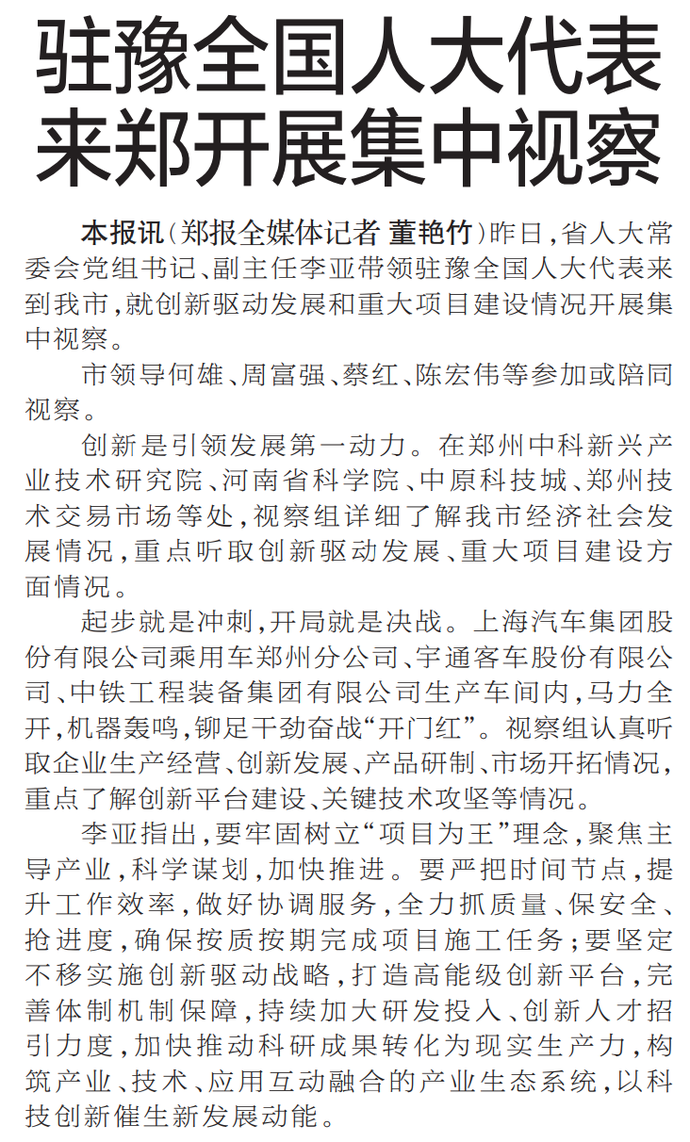 昨日,省人大常委会党组书记、副主任李亚带领驻豫全国人大代表来到我市,就创新驱动发展和重大项目建设情况开展集中视察。
