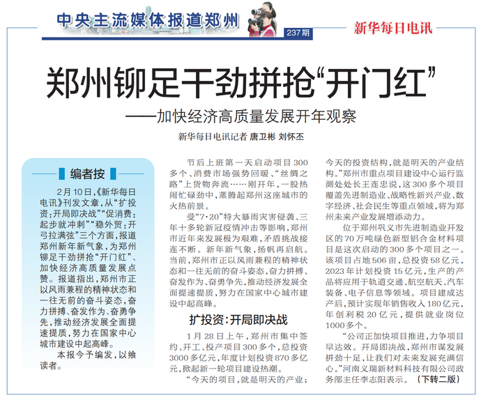 2月10日,《新华每日电讯》刊发文章,从“扩投资:开局即决战”“促消费:起步就冲刺”“稳外贸:开弓拉满弦”三个方面,报道郑州新年新气象,为郑州铆足干劲拼抢“开门红”、加快经济高质量发展点赞。报道指出,郑州市正以风雨兼程的精神状态和一往无前的奋斗姿态,奋力拼搏、奋发作为、奋勇争先,推动经济发展全面提速提质,努力在国家中心城市建设中起高峰。