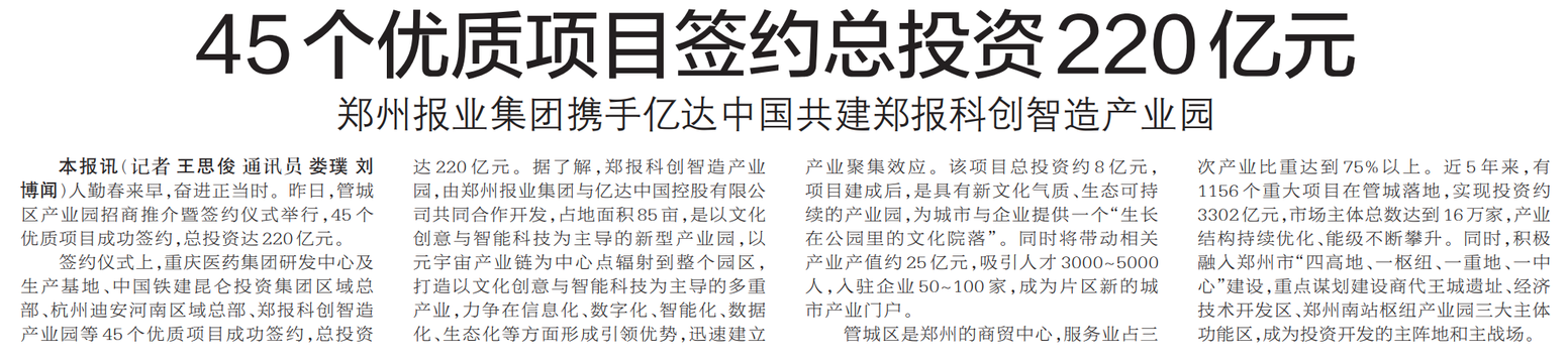 郑州报业集团携手亿达中国共建郑报科创智造产业园