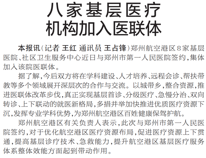 郑州航空港区8家基层医院、社区卫生服务中心近日与郑州市第一人民医院签约,集体加入该院医联体。(今日《郑州日报》2版)