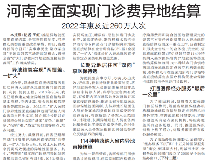 推进异地就医费用直接结算,是完善医保制度、回应群众关切的重要改革举措。昨日,省政府新闻办召开“实事惠民生 聚力谋出彩”主题系列第三场新闻发布会,通报全省“扩大门诊费用异地就医直接结算范围”工作落实情况。(今日《郑州日报》1版)