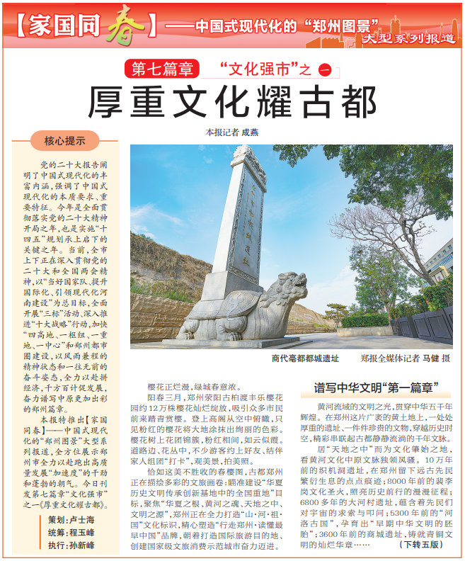 本报特推出【家国同春】——中国式现代化的“郑州图景”大型系列报道,全方位展示郑州市全力以赴跑出高质量发展“加速度”的干劲和蓬勃的朝气。今日刊发第七篇章“文化强市”之一《厚重文化耀古都》。