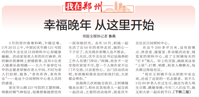 3月的郑州春寒料峭,乍暖还寒。3月20日上午,中原区伏牛路121号院内的伏牛北社区日间照料中心却暖意融融。活动室内老人们有的在打麻将、有的正躺在按摩椅上享受服务,还有8位老人随着乐曲唱跳……五六位身穿红马甲的志愿者穿梭在老人中间,不时为老人们拍照、服务。“老有所养,老有所乐”——是这个日间照料中心的老人们共同的感受。(今日《郑州日报》1版、2版)