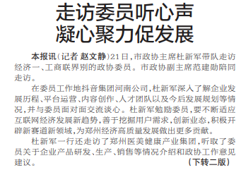 21日,市政协主席杜新军带队走访经济一、工商联界别的政协委员。市政协副主席范建勋陪同走访。(今日《郑州日报》1版、2版)
