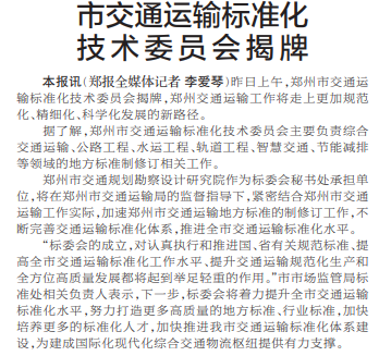 昨日上午,郑州市交通运输标准化技术委员会揭牌,郑州交通运输工作将走上更加规范化、精细化、科学化发展的新路径。(今日《郑州日报》2版)